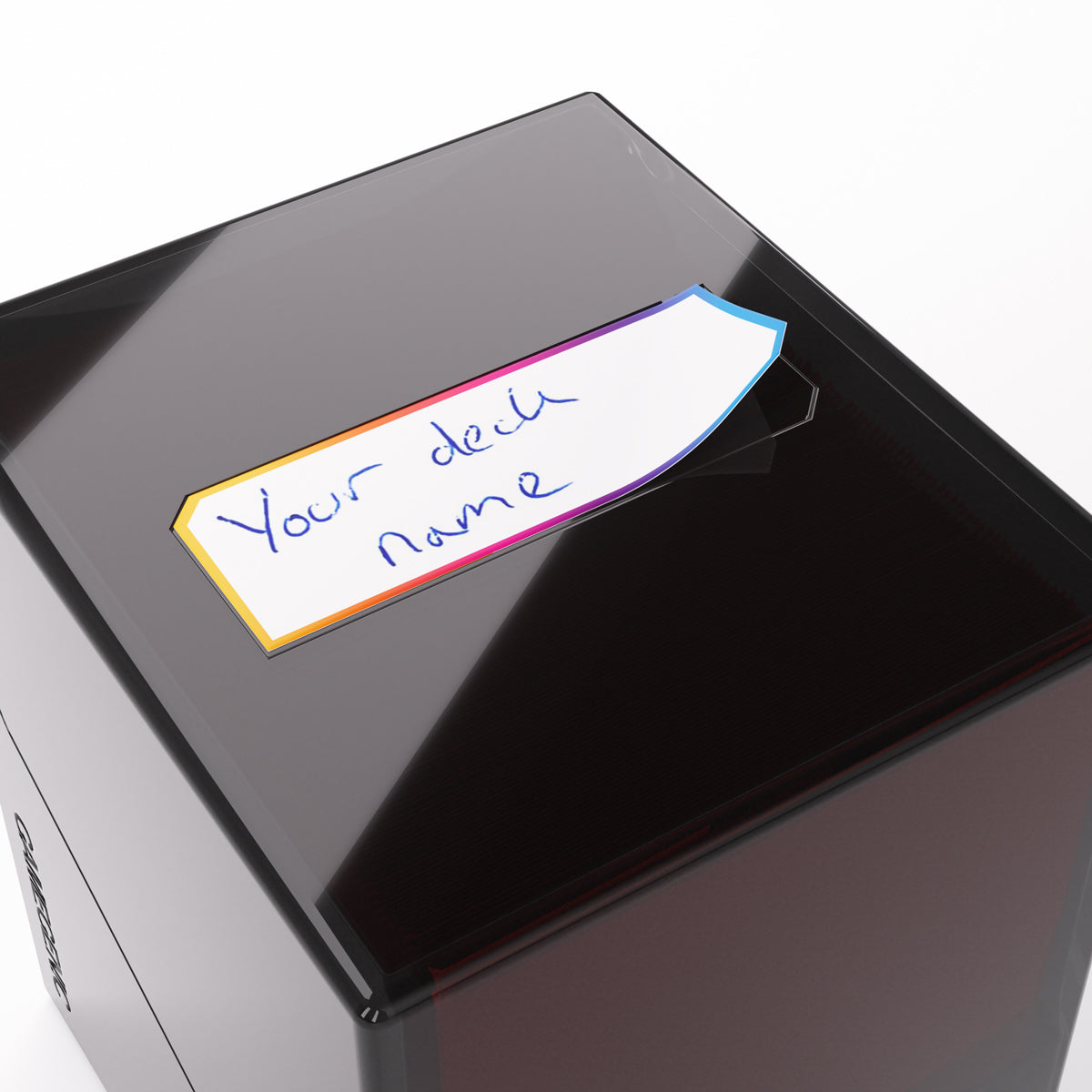 The Bastion 100+ XL is a very compact and solid deck box that safely protects 100+ double-sleeved cards in extra thick inner sleeves. Thanks to the transparent material and the intelligent positioning of the closing flaps, the top or commander card is fully visible from the outside without having to open the box. The innovative, secure locking mechanism protects the cards while still allowing easy access. The Bastion consists of 2 symmetrical parts that can easily be transformed into a card stack and discard holder. The box is perfect for a variety of trading card games. Thanks to the modular design, the Bastion fits perfectly with other Gamegenic products. It also comes with a writable sticker for personalization. The Bastion is available in 10 different colors, including an exclusive black/clear mix & match version and was rated by the Tolarian Community College with an A+.