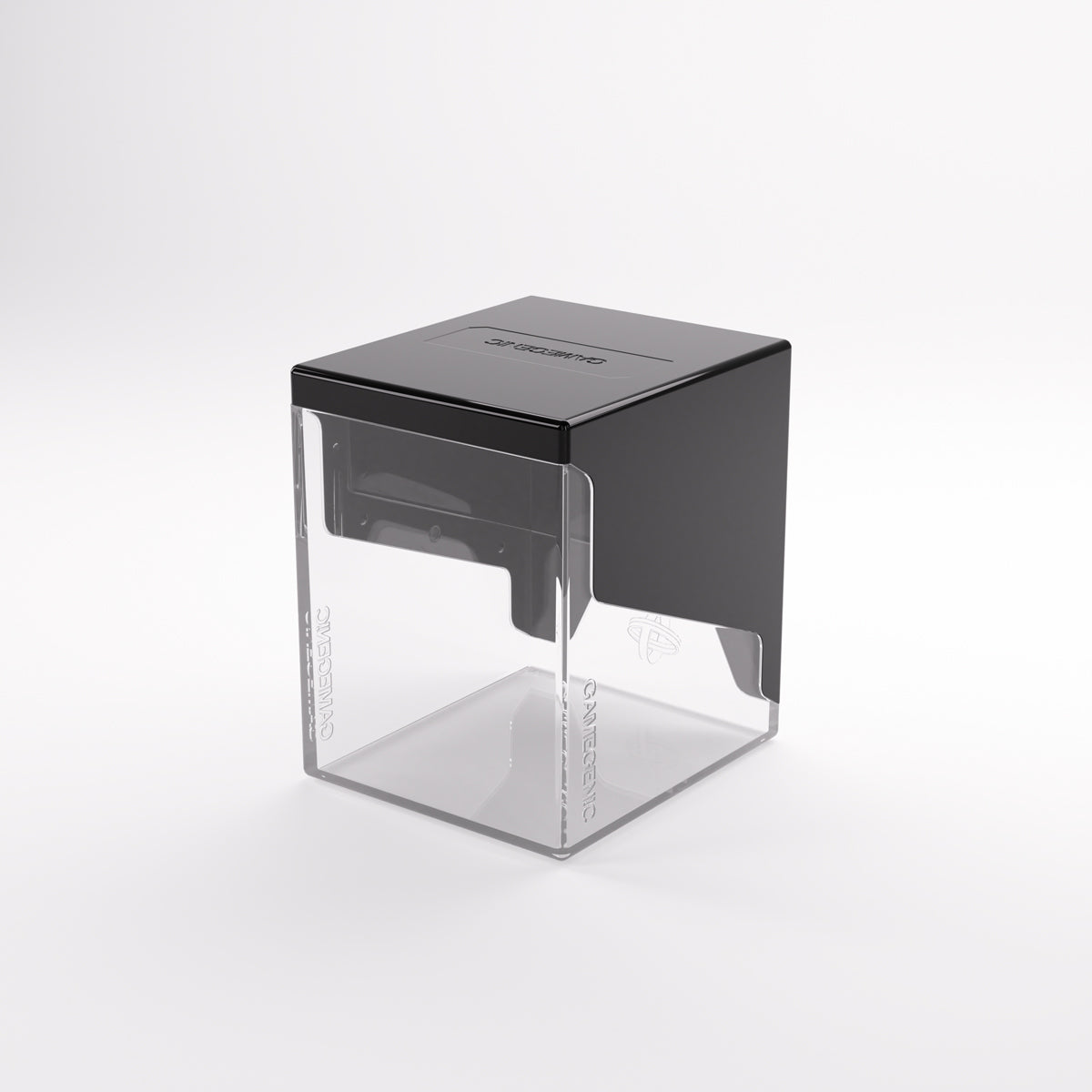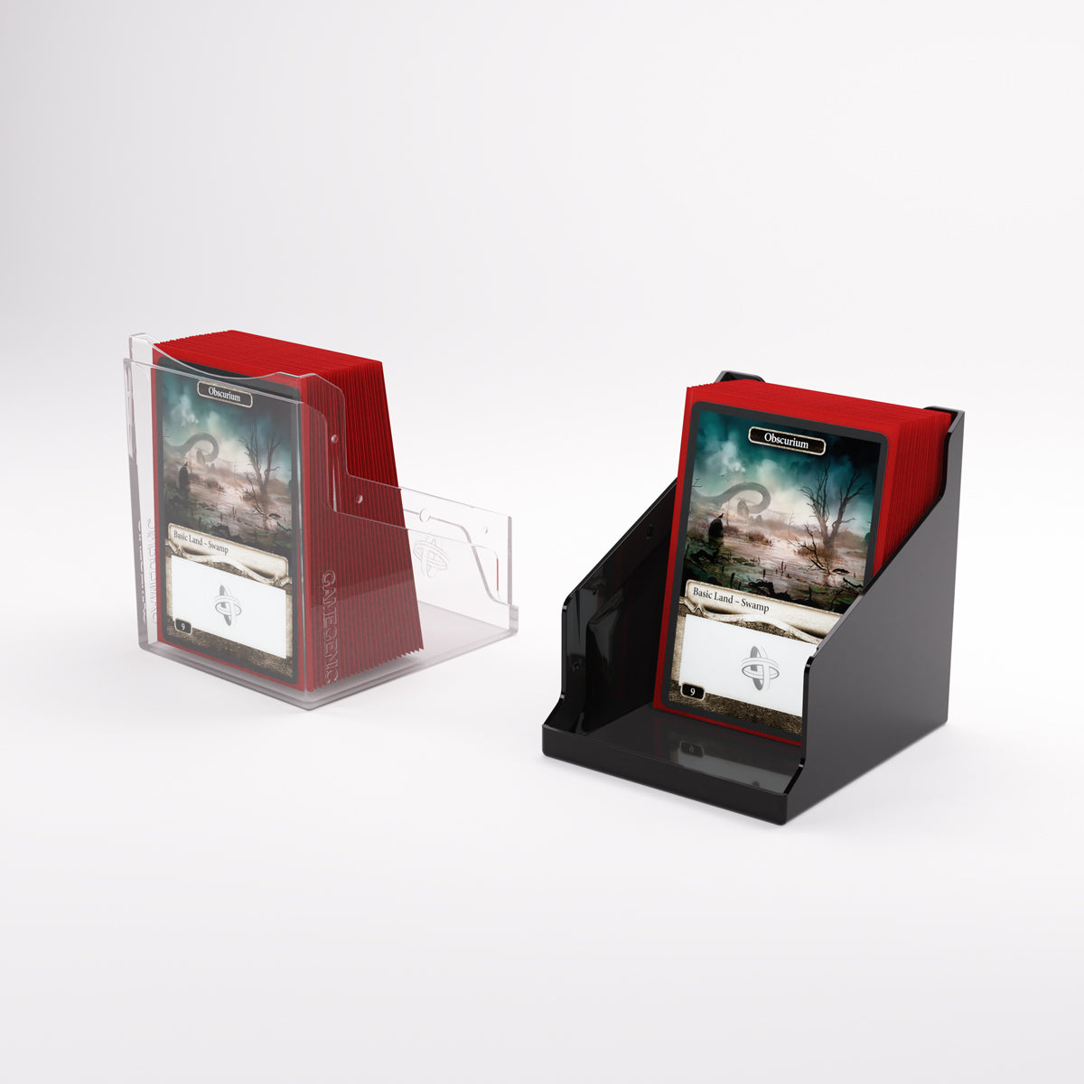 The Bastion 100+ XL is a very compact and solid deck box that safely protects 100+ double-sleeved cards in extra thick inner sleeves. Thanks to the transparent material and the intelligent positioning of the closing flaps, the top or commander card is fully visible from the outside without having to open the box. The innovative, secure locking mechanism protects the cards while still allowing easy access. The Bastion consists of 2 symmetrical parts that can easily be transformed into a card stack and discard holder. The box is perfect for a variety of trading card games. Thanks to the modular design, the Bastion fits perfectly with other Gamegenic products. It also comes with a writable sticker for personalization. The Bastion is available in 10 different colors, including an exclusive black/clear mix & match version and was rated by the Tolarian Community College with an A+.