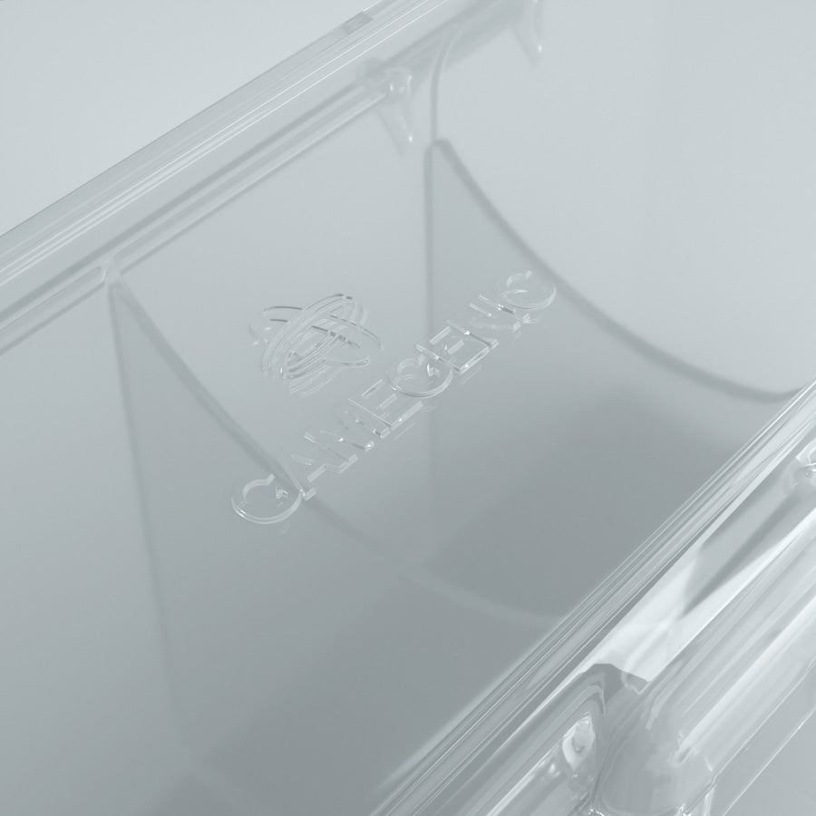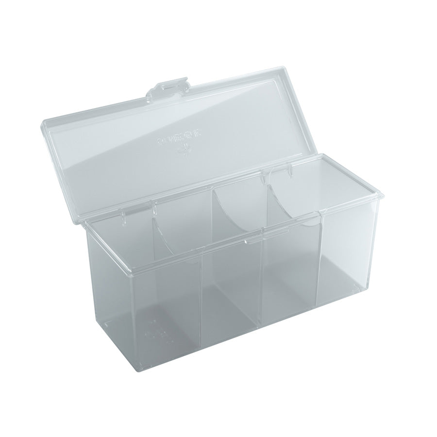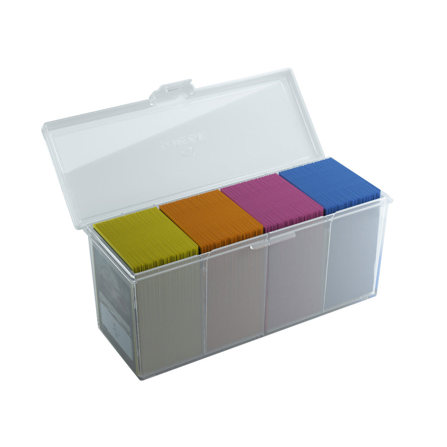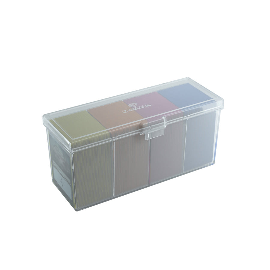 Keep your decks safe and stacked Full decks, dice, tokens or 320 double-sleeved cards: there is a lot that the Fourtress can hold and protect! This sturdy box is available in 5 different semi-transparent colors, allowing its contents to be easily identified. The integrated lock keeps it safely closed, while two inner walls can be removed to create bigger compartments. The boxes are stackable, so they are both perfect travel companions and a great storage solution at home. FEATURES 4 compartments to hold up to 320 double-sleeved cards* Rigid, stackable box with secure locking mechanism Secure locking mechanism Box resists breakage even when falling down Boxes are stackable Acid-free, no PVC * Optimized for Gamegenic Sleeves. Sleeves from other brands may affect capacity/compatibility SPECIFICATIONS Product size 218 x 80 x 99 mm Material Polypropylene Packaging type Shrink Foil