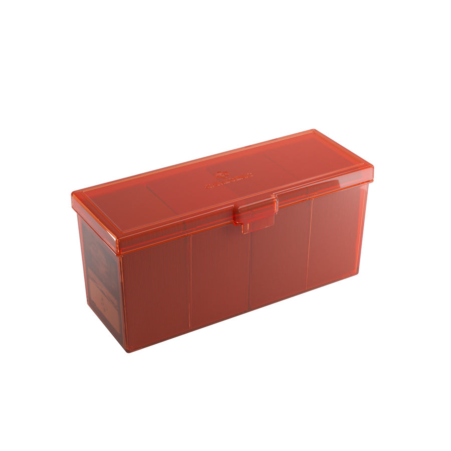 Keep your decks safe and stacked Full decks, dice, tokens or 320 double-sleeved cards: there is a lot that the Fourtress can hold and protect! This sturdy box is available in 5 different semi-transparent colors, allowing its contents to be easily identified. The integrated lock keeps it safely closed, while two inner walls can be removed to create bigger compartments. The boxes are stackable, so they are both perfect travel companions and a great storage solution at home. FEATURES 4 compartments to hold up to 320 double-sleeved cards* Rigid, stackable box with secure locking mechanism Secure locking mechanism Box resists breakage even when falling down Boxes are stackable Acid-free, no PVC * Optimized for Gamegenic Sleeves. Sleeves from other brands may affect capacity/compatibility SPECIFICATIONS Product size 218 x 80 x 99 mm Material Polypropylene Packaging type Shrink Foil