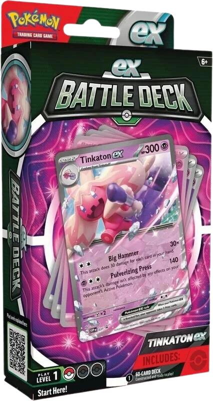 Two new ex Battle Decks are coming to the Pokémon TCG: The Tinkaton ex Battle Deck and the Chien-Pao ex Battle Deck. Each of these will include their SV Black Star Promo Card featuring the eponymous Pokémon, a 6o-card deck, reference cards, a rule booklet, a single-player playmat, damage counters, a metallic coin, a deck box, and a code card.